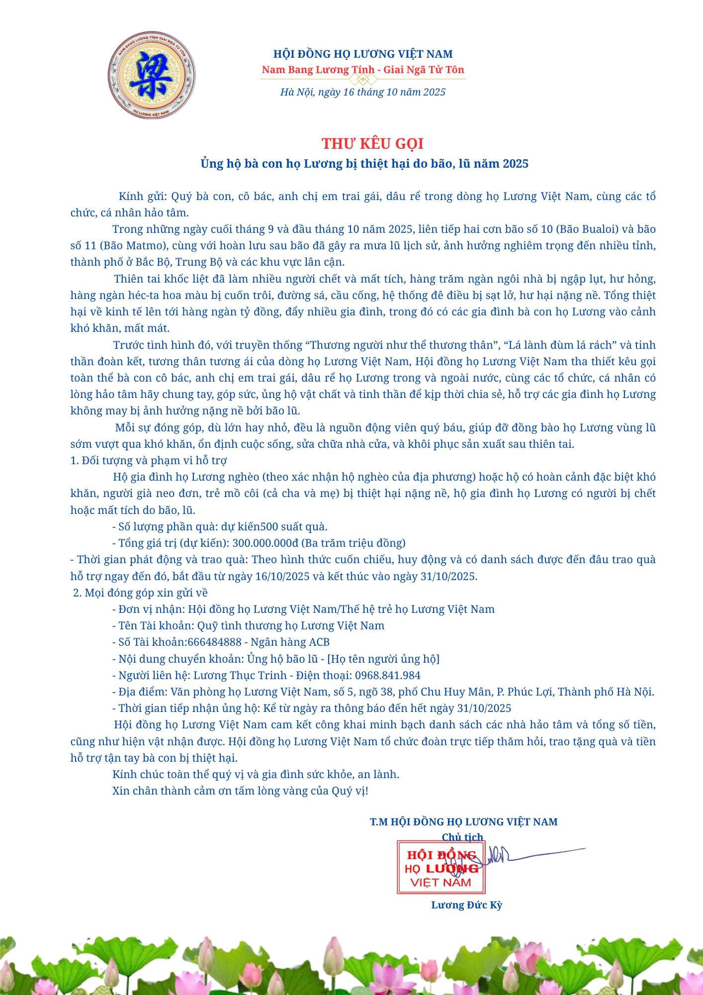 Vừa qua, cơn bão số 10, số 11 và hoàn lưu sau bão đã gây ra nhiều thiệt hại nặng nề về người, tài sản tại một số tỉnh phía bắc, các tỉnh bắc miền Trung. Hai cơn bão trên đã làm hàng chục người chết và mất tích, hàng trăm người bị thương, hàng vạn ngôi nhà bị hư hỏng, hàng ngàn hecta hoa màu, thủy sản, vật nuôi và tài sản trong nhà bị cuốn trôi. Tổng thiệt hại về kinh tế lên tới hàng ngàn tỉ đồng. Trong những thiệt hại nặng nề đó có thiệt hại, mất mát của bà con họ Lương. Để động viên và giúp đỡ bà con họ Lương khắc phục một phần thiệt hại, ông Lương Đức Kỳ, Chủ tịch Hội đồng họ Lương Việt Nam kêu gọi toàn thể bà con, cô bác, anh chị em trai gái, dâu rể, các tổ chức, cá nhân hảo tâm trong cộng đồng họ Lương phát huy truyền thống “Thương người như thể thương thân” ủng hộ, tài trợ để có 500 phần quà, mỗi phần quà trị giá từ 500 ngàn đồng gửi đến các gia đình bị thiệt hại. Trang thông tin điện tử Họ Lương Việt Nam xin giới thiệu toàn văn lời kêu gọi này.
