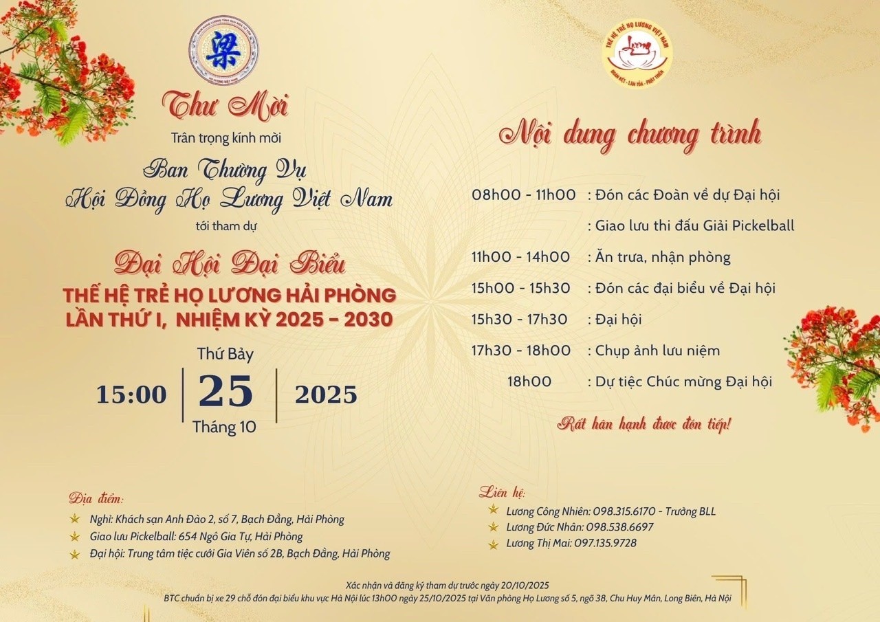 Được sự đồng ý của Thường trực Hội đồng họ Lương Việt Nam, Thường trực Ban chấp hành Thế hệ trẻ họ Lương Việt Nam, Thế hệ trẻ họ Lương thành phố Hải Phòng tổ chức Đại hội đại biểu lần thứ I, nhiệm kỳ 2025 – 2030 vào ngày 25/10/2025 tại Trung tâm sự kiện Gia Viên, số 2B Bạch Đằng, thành phố Hải Phòng.