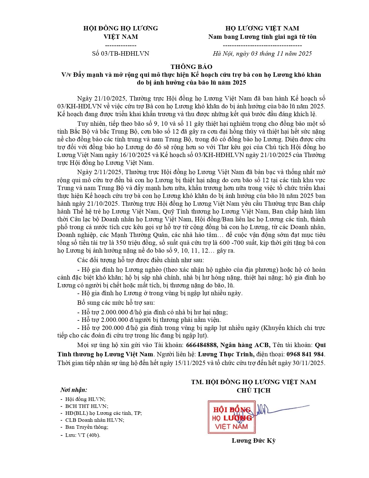 Ngày 2/11/2025, Thường trực Hội đồng họ Lương Việt Nam đã tổ chức Hội nghị trực tuyến để bàn biện pháp đẩy mạnh tiến độ và mở rộng qui mô thực hiện kế hoạch cứu trợ bà con họ Lương khó khăn do ảnh hưởng nặng nề của bão lũ năm 2025. Tham dự Hội nghị trực tuyến có các ông bà là Thường trực Hội đồng họ Lương Việt Nam, Thường trực Ban chỉ đạo cứu trợ. Ông Lương Đức Kỳ, Chủ tịch Hội đồng họ Lương Việt Nam chủ trì phiên họp. Hội nghị đã bàn thảo chi tiết và kết luận: Cần đẩy mạnh tiến độ thực hiên, mở rông thêm qui mô cứu trợ đến đối tượng bị ảnh hưởng bởi các cơn bão số 9, 10, 11 và 12.Tăng tổng mức huy động lên 350 triệu đồng, số lượng suất quà cứu trợ là 600-700 suất với mức giá trị tối thiểu là 200 ngàn đồng/1 suất quà, tối đa 5 triệu đồng, bổ sung 2 đối tượng với mức hỗ trợ 2 triệu đồng/1 suất. Mọi sự ủng hộ xin được gửi về Tài khoản: 666484888, Ngân hàng ACB; Tên tài khoản: Quĩ Tình thương họ Lương Việt Nam. Điện thoại liên hệ: Lương Thục Trinh – 0968 841 984.