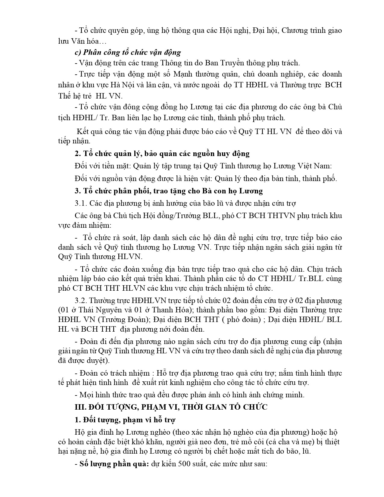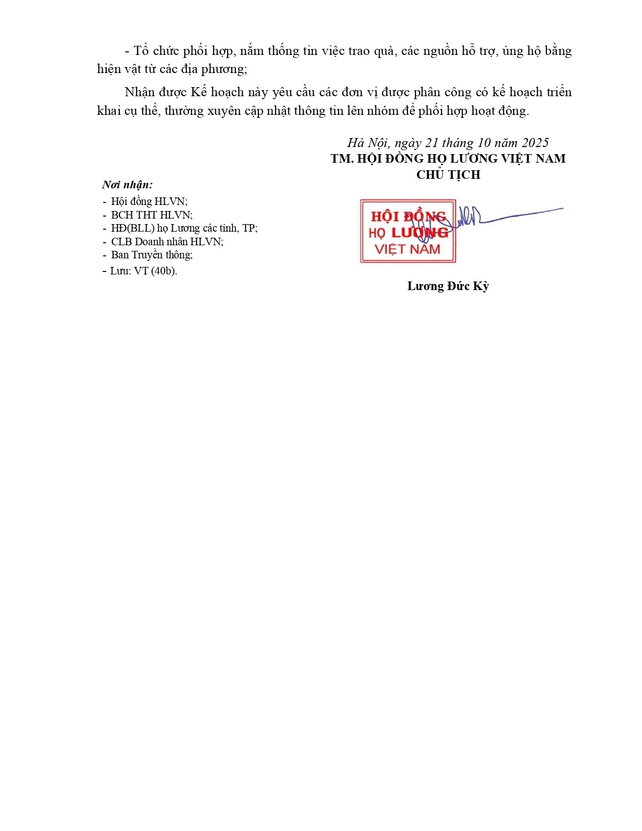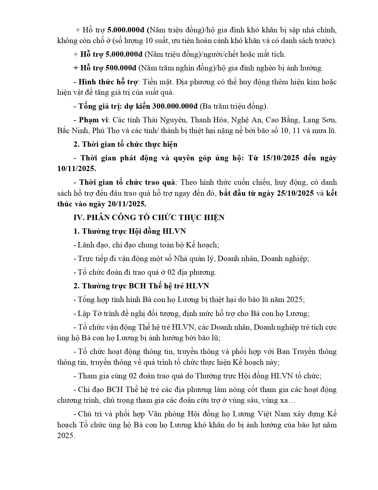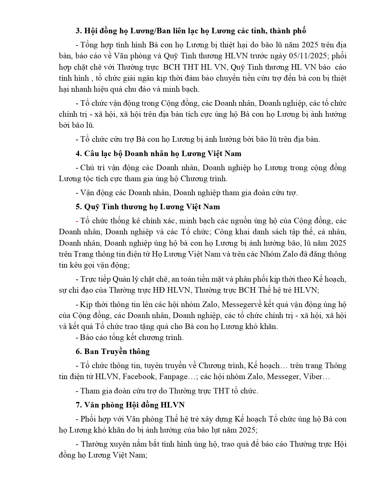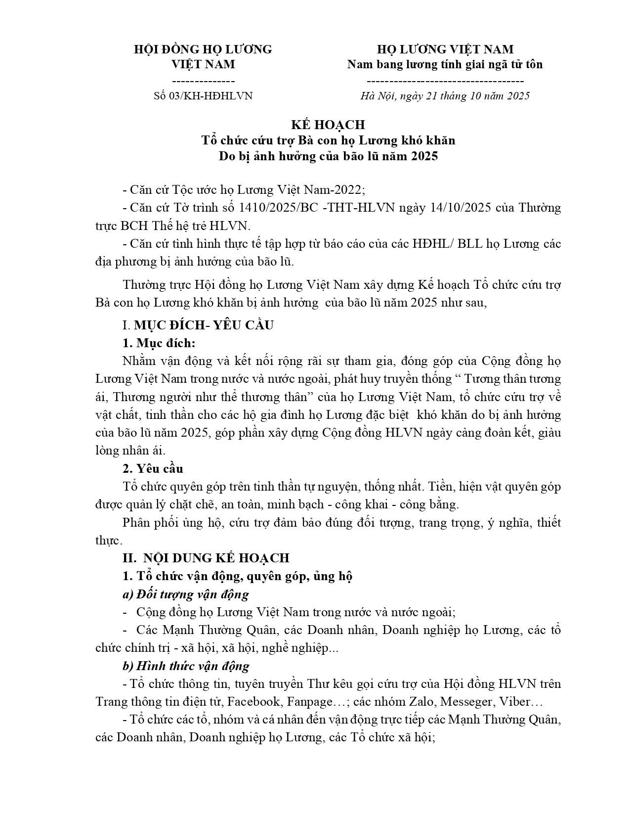 Trong những ngày vừa qua, đồng hành cùng nhân dân cả nước thực hiện cuộc vận động ủng hộ đồng bào bị thiệt hại do cơn bão số 10, 11 gây ra, Chủ tịch Hội đồng họ Lương Việt Nam đã phát Lời kêu gọi cộng đồng họ Lương thực hiện cứu trợ bà con trong dòng tộc bị ảnh hưởng bởi hai cơn bão này và đã nhận được sự ủng hộ rất tích cực, kết quả bước đầu rất khả quan. Để thúc đẩy việc thực hiện tiến độ cuộc vận động nhanh cán đích 300 triệu đồng với 500 phần quà, trị giá mỗi phần quà từ 500 ngàn đồng, Hội đồng họ Lương Việt Nam ban hành Kế hoạch số 03/KH-HĐHL VN về Tổ chức cứu trợ Bà con họ Lương khó khăn do bị ảnh hưởng của bão, lũ năm 2025. Kế hoạch đã xác định chi tiết mục đích, yêu cầu, nội dung, đối tượng, phạm vi, thời gian và phân công cụ thể tổ chức thực hiện cho Thường trực Hội đồng họ Lương Việt Nam, Văn phòng và các ban chuyên môn của Hội đồng họ Lương Việt Nam, Thường trực Ban chấp hành Thế hệ trẻ họ Lương Việt Nam, Quỹ Tình thương họ Lương Việt Nam, Câu lạc bộ Doanh nhân họ Lương Việt Nam, Hội đồng/Ban liên lạc họ Lương các tỉnh, thành phố.