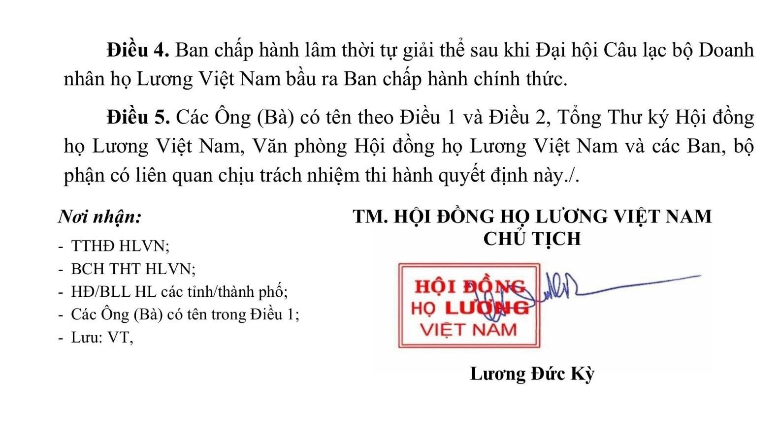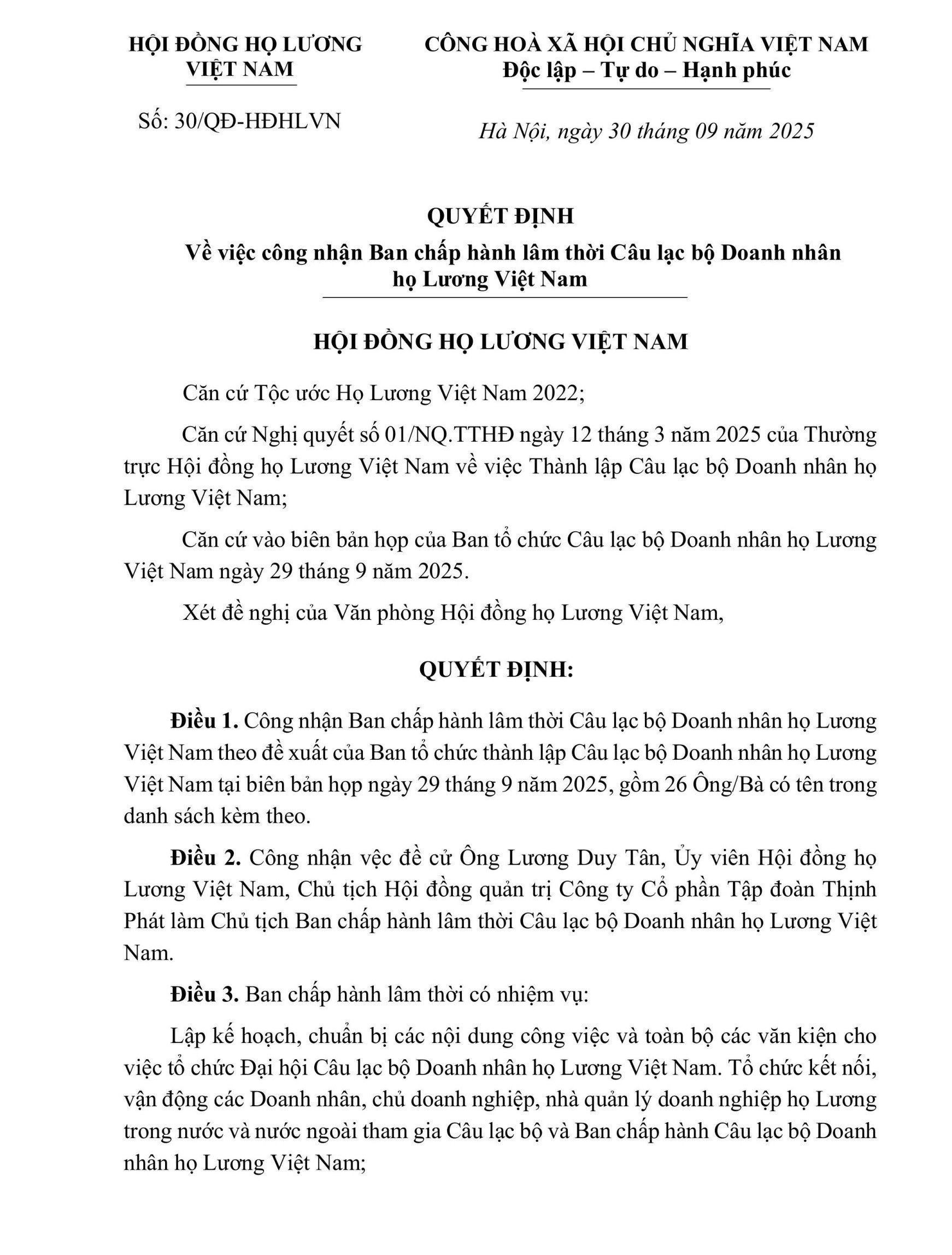 Trang thông tin điện tử Họ Lương Việt Nam trân trọng giới thiệu Quyết định của Hội đồng họ Lương Việt Nam về việc công nhận Ban chấp hành lâm thời Câu lạc bộ Doanh nhân họ Lương Việt Nam do ông Lương Duy Tân làm Chủ tịch.