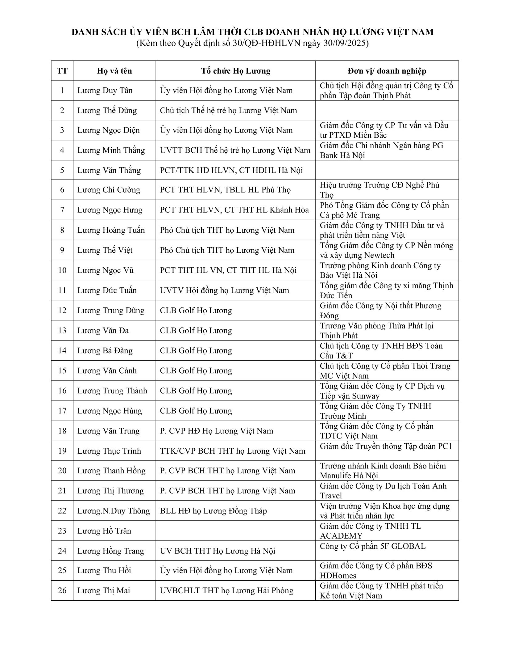Ngày 29 tháng 9 năm 2025 tại Văn phòng họ Lương Việt Nam, số 5/38 phố Chu Huy Mân, phường Phúc Lợi, thành phố Hà Nội, Ban tổ chức Câu lạc bộ Doanh nhân họ Lương Việt Nam tổ chức phiên họp lần thứ nhất để đề cử 26 doanh nhân tiêu biểu đại diện các tỉnh, thành phố, các khu vực tham gia Ban chấp hành lâm thời Câu lạc bộ Doanh nhân họ Lương Việt Nam. Tham dự phiên họp có các doanh nhân tham gia Ban tổ chức Câu lạc bộ và Ban chấp hành lâm thời. Ông Lương Duy Tân, Trưởng ban tổ chức thành lập Câu lạc bộ chủ trì phiên họp. Ông Lương Đức Kỳ, Chủ tịch Hội đồng họ Lương Việt Nam tham dự và chỉ đạo hội nghị. Dự kiến Ban chấp hành lâm thời Câu lạc bộ Doanh nhân họ Lương Việt Nam sẽ ra mắt vào dịp Ngày Doanh nhân Việt Nam 13/10/2025.